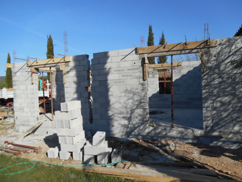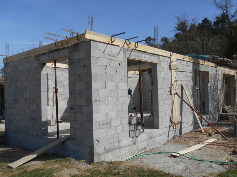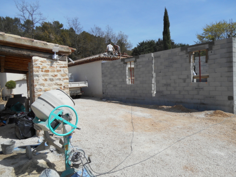 Un second agrandissement a été construit sur une autre façade de l’habitation. Plus petite, il nous a tout de même fallu reprendre les fondations existantes pour les renforcer, puis monter les murs en parpaings. Nous avons également effectué le prolongement du toit existant.