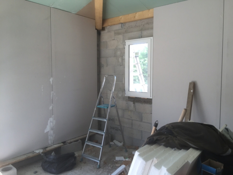 Nous avons donc commencé par la réalisation des fondations et le coulage de la dalle en béton afin de supporter toute la structure. Nous avons ensuite monté les mûrs en parpaing. Afin d’intégrer cet agrandissement à la structure existante, nous avons dû modifier le toit de l’existant afin de l’intégrer en prolongement sur la nouvelle structure. Dans la foulée, nous avons monté la charpente et son isolation puis la couverture en tuile du toit. Nous avons ensuite posé les huisseries.