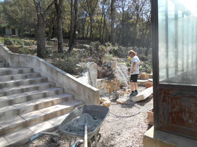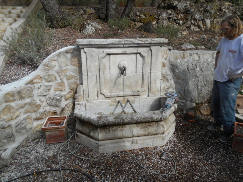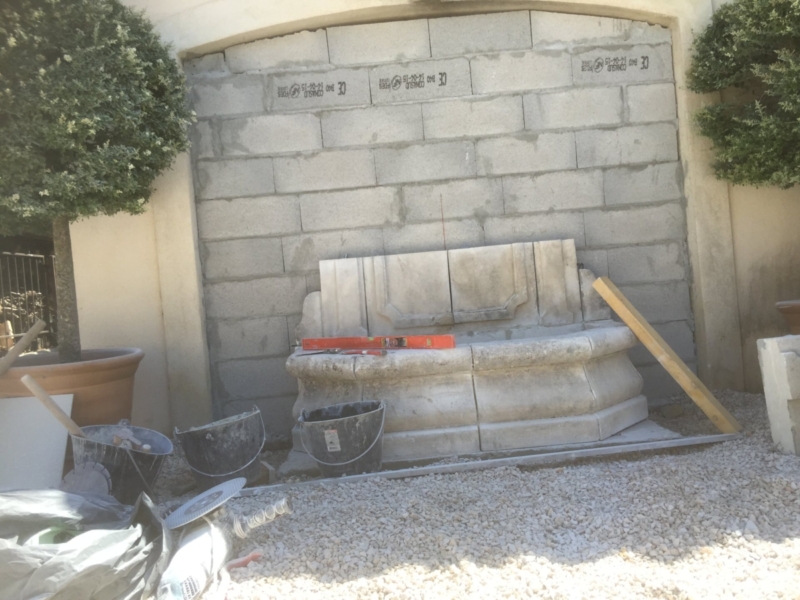 Nous avons également fermé à l’aide d’un mur en parpaing une ouverture dans un mur. Ceci a permis de créer une nouvelle pièce close pour la maison. Sur l’extérieur, afin de décorer ce nouveau mur, nous avons déplacé une ancienne fontaine avec bassin. Notre expertise en taille de pierre nous ayant permis de découper et replacer proprement cette fontaine.
