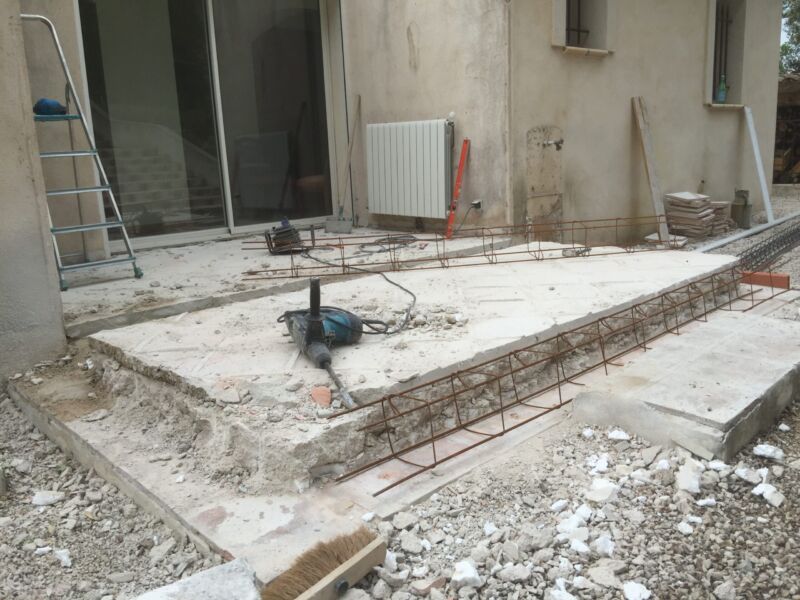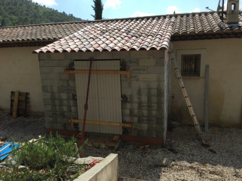 Un second agrandissement a été construit sur une autre façade de l’habitation. Plus petite, il nous a tout de même fallu reprendre les fondations existantes pour les renforcer, puis monter les murs en parpaings. Nous avons également effectué le prolongement du toit existant.