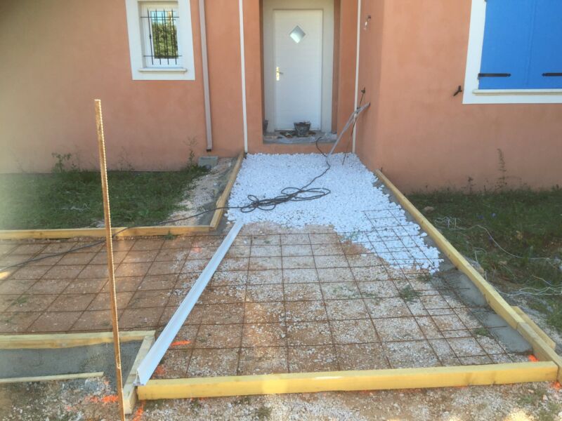 Nous avons également effectué la construction de deux grands escaliers en béton. L’un d’eux partant du devant de la maison pour rejoindre la terrasse à l’arrière. L’autre raccordant la terrasse couverte à la plage de la piscine.